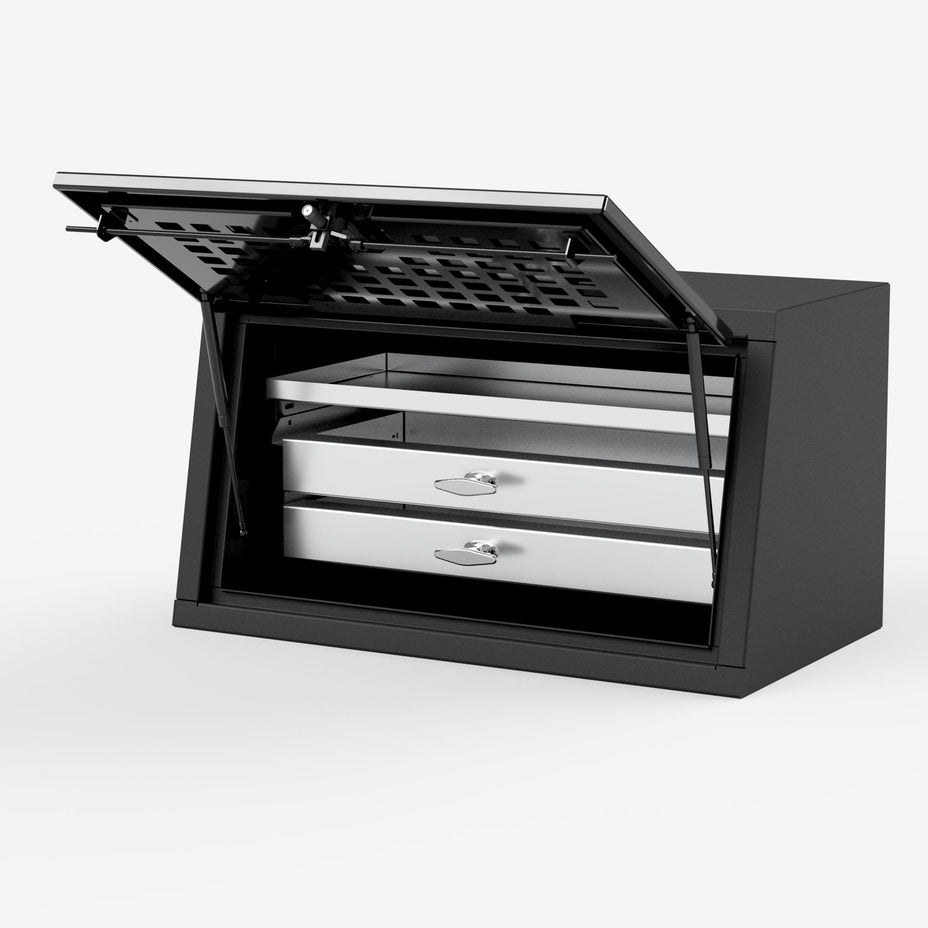 A complete bolt together system made for easy removal and installation. With top rails that feature slotted holes for accessories, and a back glass protector with even more mounting space. The weather-tight boxes come with a modular side rail to bolt in shelves and drawers to any height.